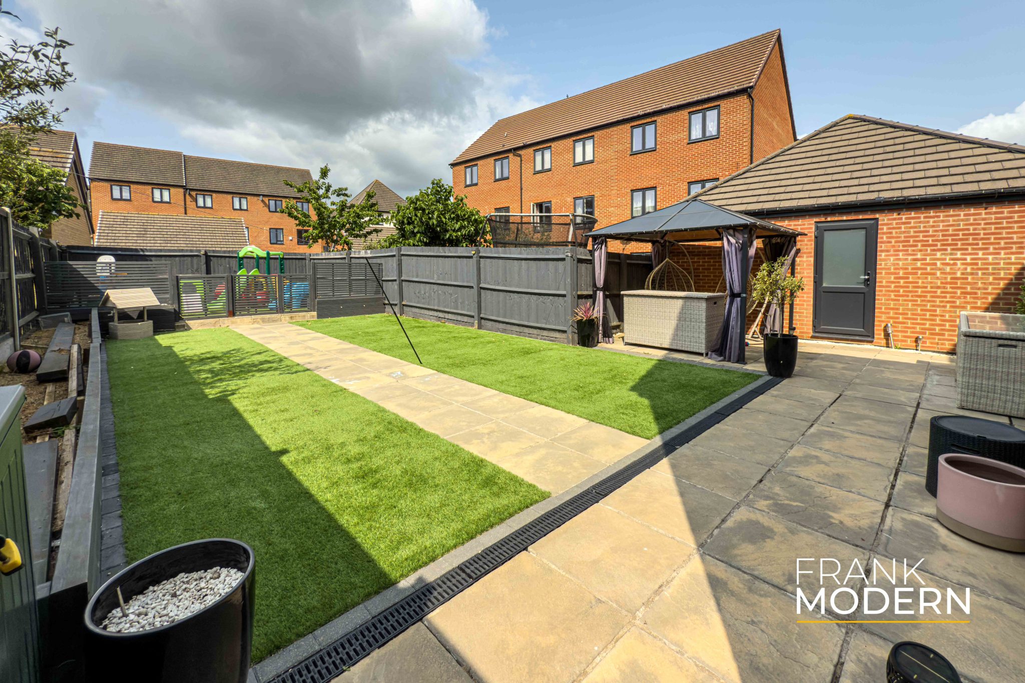 A block-paved double driveway extends to the side of the house, leading to the single garage with up-and-over doors, power, and lighting. Behind the house lies an enclosed south-facing garden featuring two patio areas separated by artificial lawns, along with a built-in timber seating area at the top of the garden.