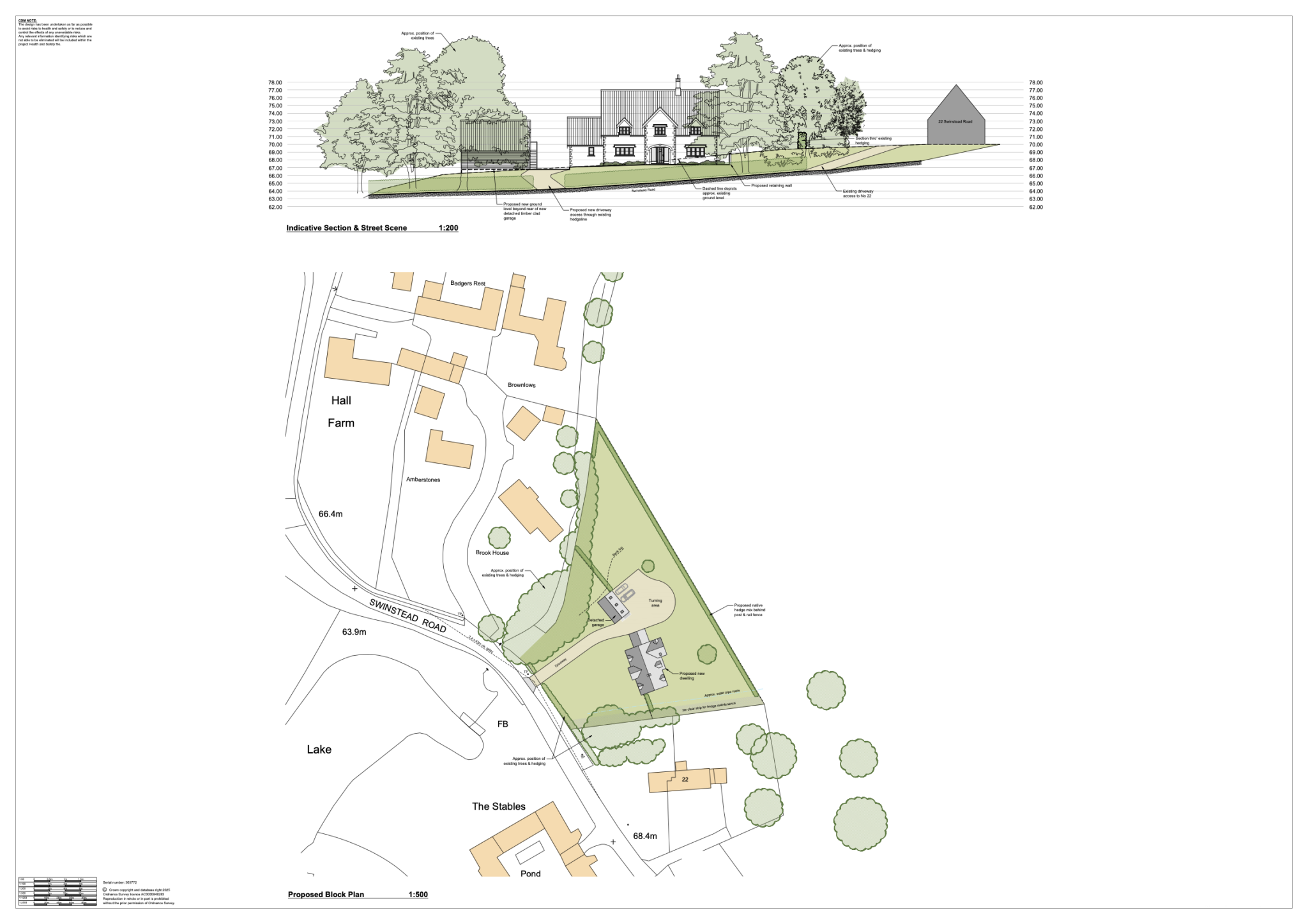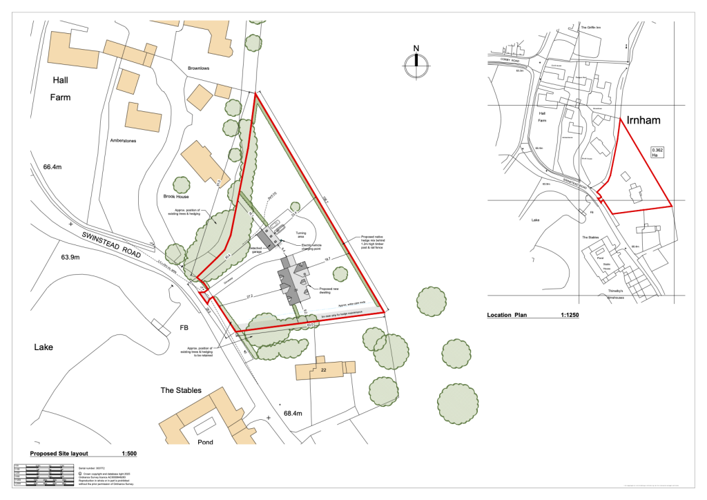 Viewing: The plot is located between No. 21 and 22 Swinstead Road and Brook House. Direct access from Swinstead Road is not yet available; instead, access is via the rear of the Griffin Inn’s car park, using the footpath and stile over the brook. When you cross the stile, turn right and follow the boundary hedge on your right. Walk for about 100 metres, and you will reach the start of the plot.